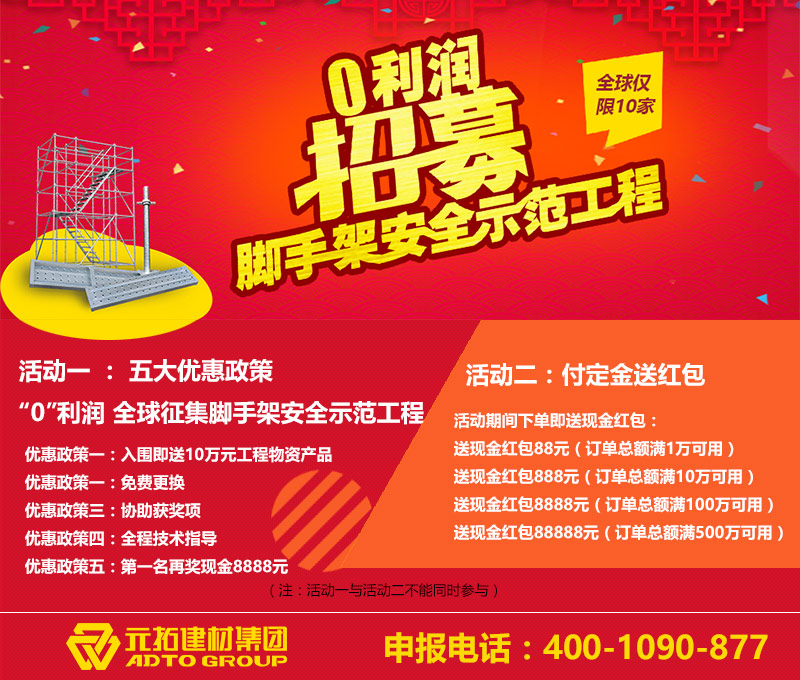為迎接元拓成立20周年,將元拓一直倡導(dǎo)的“安全”生產(chǎn)理念傳承下去,打造安全腳手架制造專家興業(yè)標(biāo)桿品牌,2017年2月底,湖南元拓建材集團(tuán)第一屆“腳手架安全示范工程”施工企業(yè)招募活動(dòng)正式啟動(dòng),特向全國(guó)征集10家具有壹級(jí)(含)以上施工資質(zhì)的施工企業(yè),打造“零利潤(rùn),…